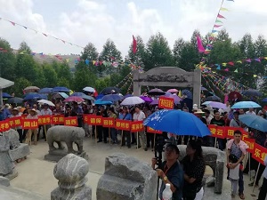 墓园一幅醒目的“隆重纪念元朝怀远大将军岑世兴”横挂在墓上方,四面大旗代表田州、镇安、泗城、思恩四路大军守护着墓主。48面彩旗迎风招展,21面三角旗路边引航。69条三角条旗为宗亲遮风挡雨。仪式前义圩镇朔晚村16名庙会歌手为先祖献歌敬酒,那沙庄38位身着民族服装姑娘以壮乡独有嘹歌敬献给祖先。田林县宗亲会送来祝福横挂在入口处迎接嘉宾,桂平市、右江区等宗亲岑旗牢牢插在主持台前。宗亲们相互交流、致意,墓园场地处处洋溢着热烈、温馨、祥和的兄弟姐妹情。