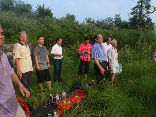 大家不怕艰辛,头顶烈日,脚踏荆棘,举步维艰地来到了岑毓英墓前。众人不约而同地齐心协力开始清理墓地杂草,之后,上香、献果、敬酒。紧接着,众宗亲先后向毓英公及原配江夫人行三躹躬礼,礼毕,鸣炮。接着,黄振南教授简单地介绍:1、从墓的地理位置看,完全符合古人的“左青龙,右白虎”墓葬观念。2、岑毓英墓虽遭多次被盗毁,后经当地文物队的修缮,还基本上保存原貌,岑毓英墓葬是广西现存最大的清代坟茔。3、该山植被繁茂,四季葱绿,尧山风景如画,是桂林的游览胜地之一,更是一块风水宝地。