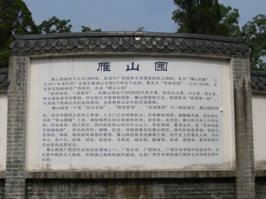 16、 雁山园始建于公元1869年,是清代广西桂林士绅唐岳的私人园林,名为“雁山别墅”。公元1911年清代两广总督岑春煊以纹银4万两买下此园,更名为“西林花园”。公元1929年,岑氏将花园捐献给广西政府,改名“雁山公园”